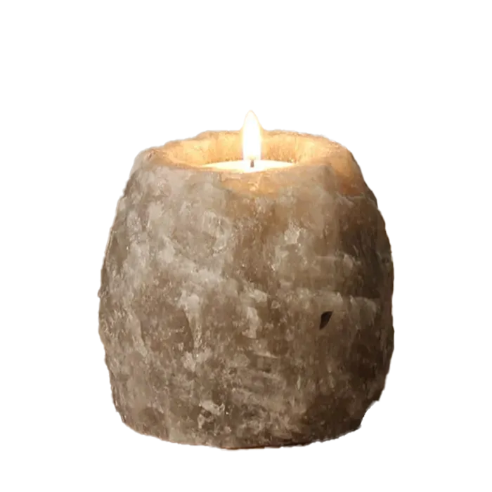 Himalayan Gray Salt Candle Holder, offering a warm ambient glow, natural air purification, and a modern, sophisticated design.