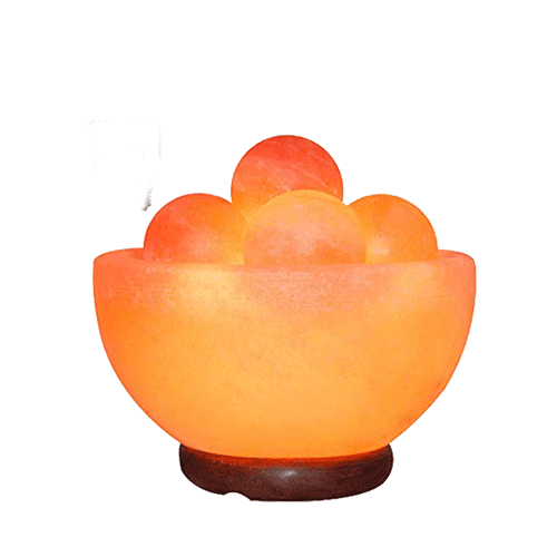 Beautiful Himalayan Salt Fire Bowl with round salt balls, providing a warm ambient glow, natural air purification, and a unique decorative style.